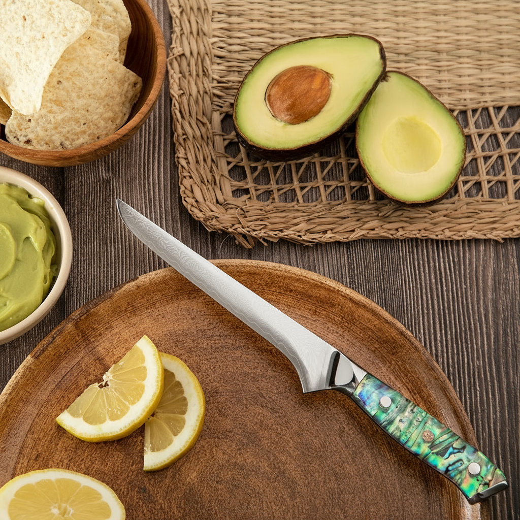 Notre couteau à désosser est l'outil parfait pour tous ceux qui prennent la cuisine au sérieux. La lame est conçue avec un angle d'affûtage de 15° de chaque côté de la lame, ce qui vous permet de trancher sans effort les os et la viande. L'acier damas à 67 couches offre un bel équilibre délicat entre la ténacité et la dureté pour couper n'importe quel ingrédient sans effort. Le manche est conçu avec un matériau nacré qui est facile à saisir. Notre couteau à désosser a été créé pour les chefs qui souhaitent faire passer leurs compétences culinaires au niveau supérieur.