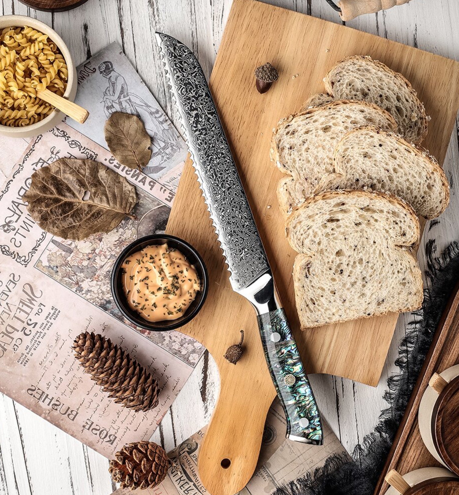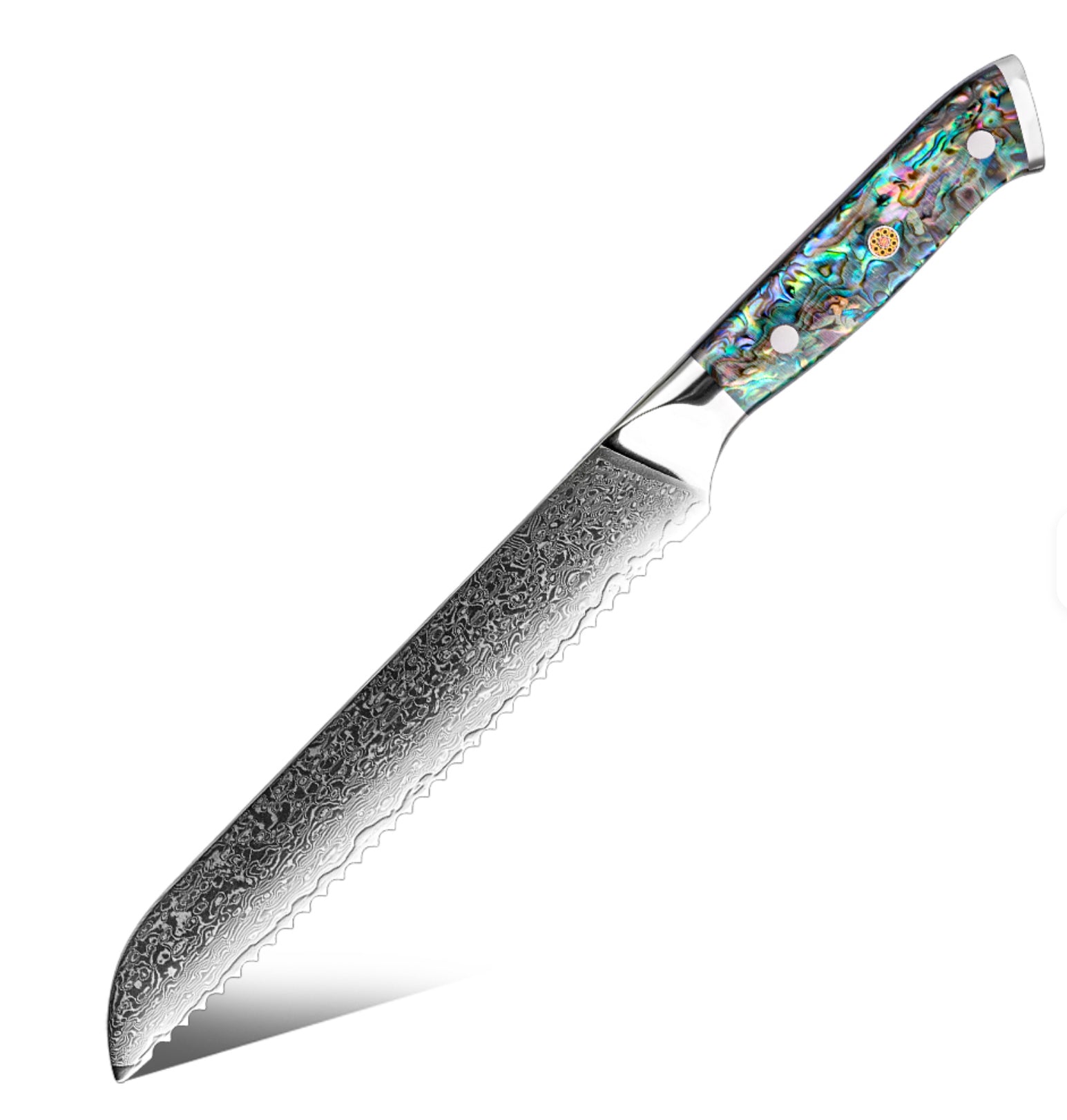 Lame de qualité supérieure : La lame du couteau à pain Nagasaki est fabriquée à partir d'acier damas 67 couches de haute qualité, assurant une durabilité exceptionnelle et une résistance à la corrosion. La forme de la lame est conçue pour permettre des coupes nettes à travers une variété de pains, pâtisseries et produits de boulangerie.
