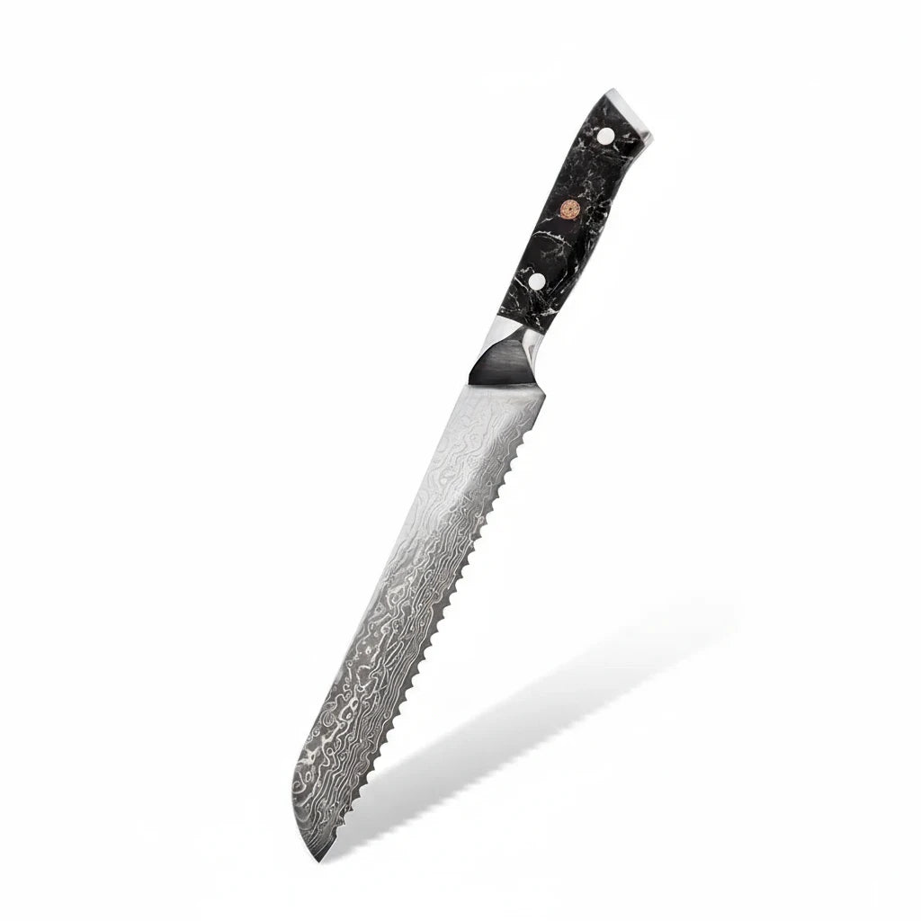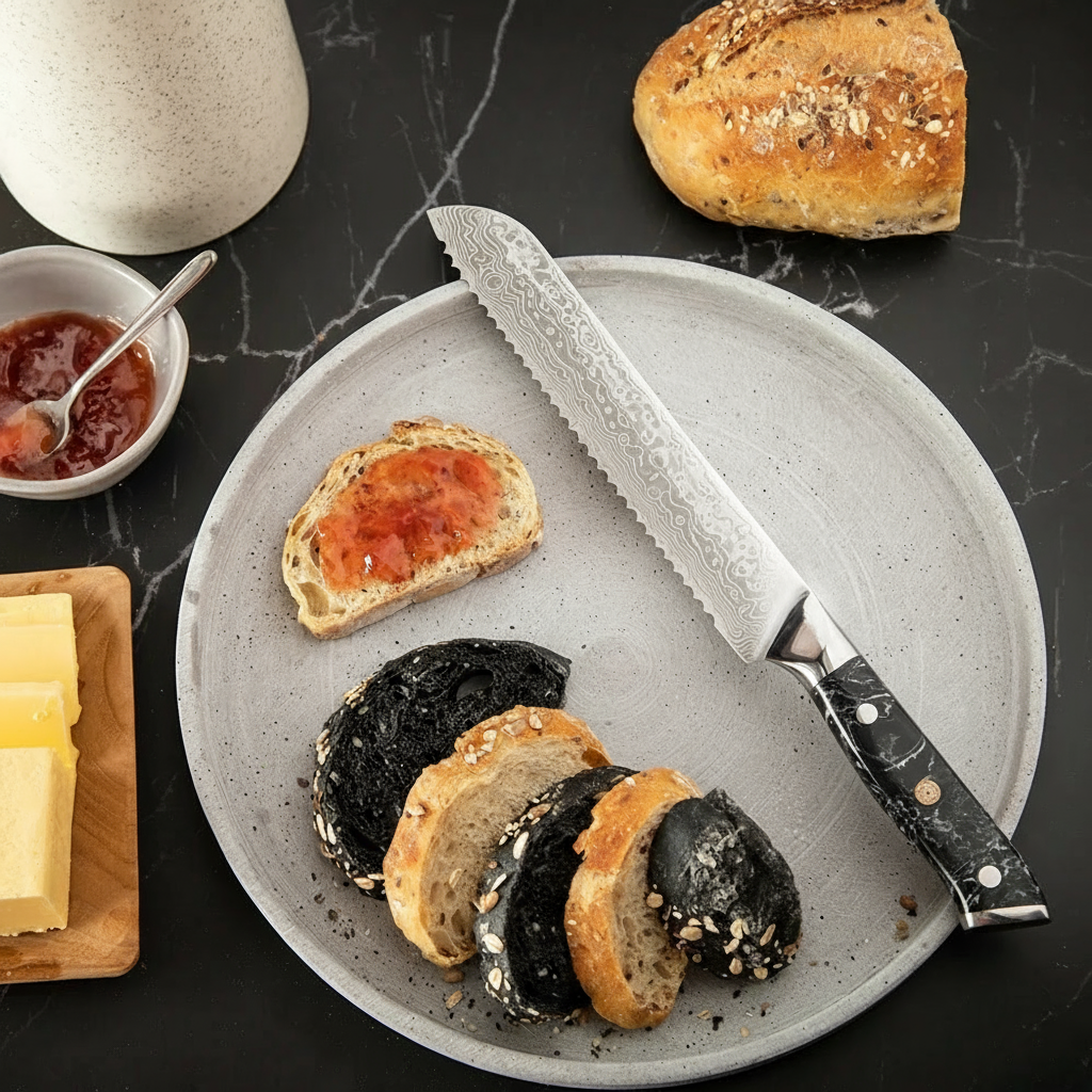 S’il permet de réaliser de nombreuses découpes avec une très grande précision, le couteau à pain Nagoya est aussi un couteau en acier damas qui attire l’attention. Design, minimaliste, élégant, authentique, les adjectifs s’accumulent pour décrire ce couteau à pain en acier damassé avec un manche en pierre blanche et noire. L’effet marbré du manche fait écho aux différents dessins de l’acier de damas présents sur la lame du couteau à pain Nagoya.