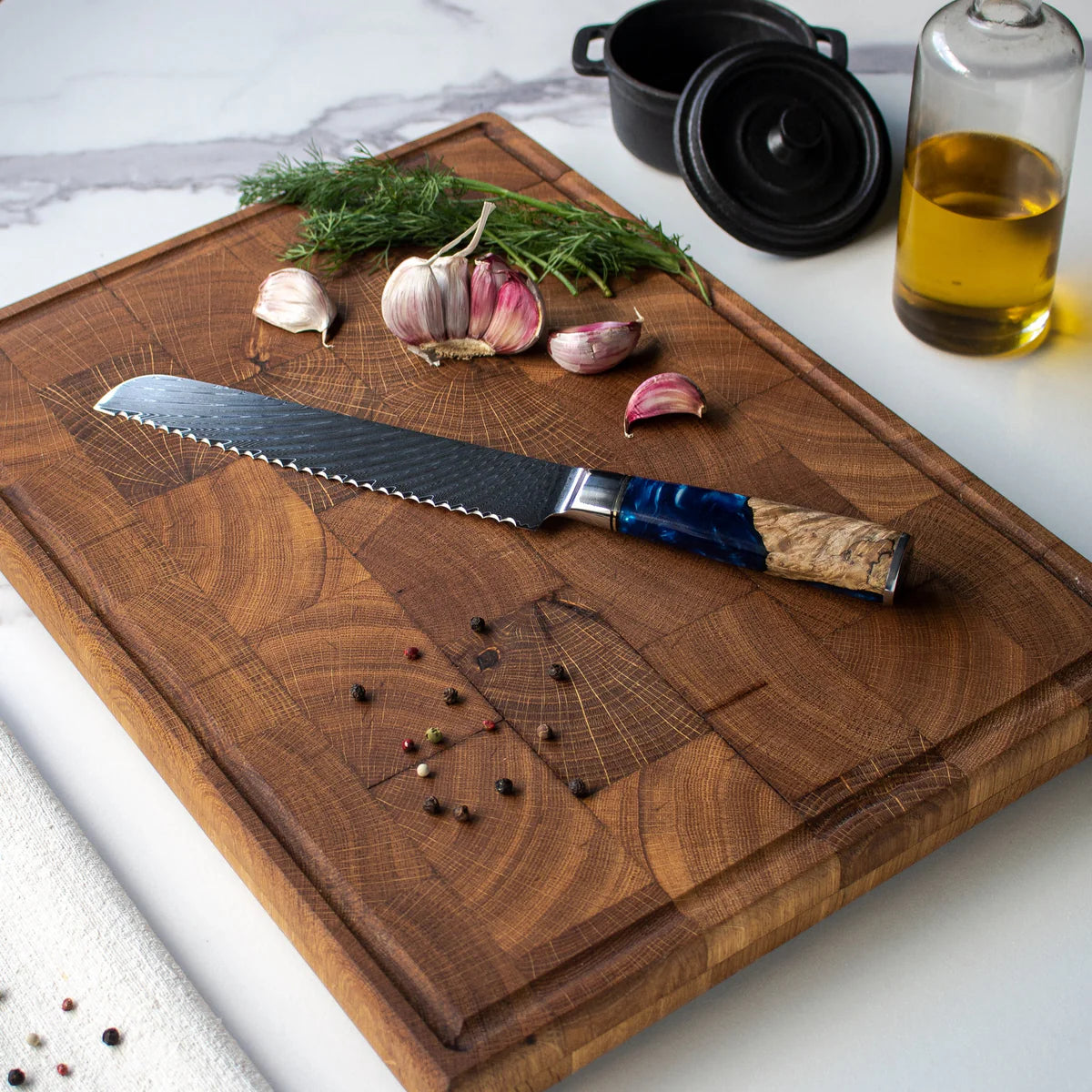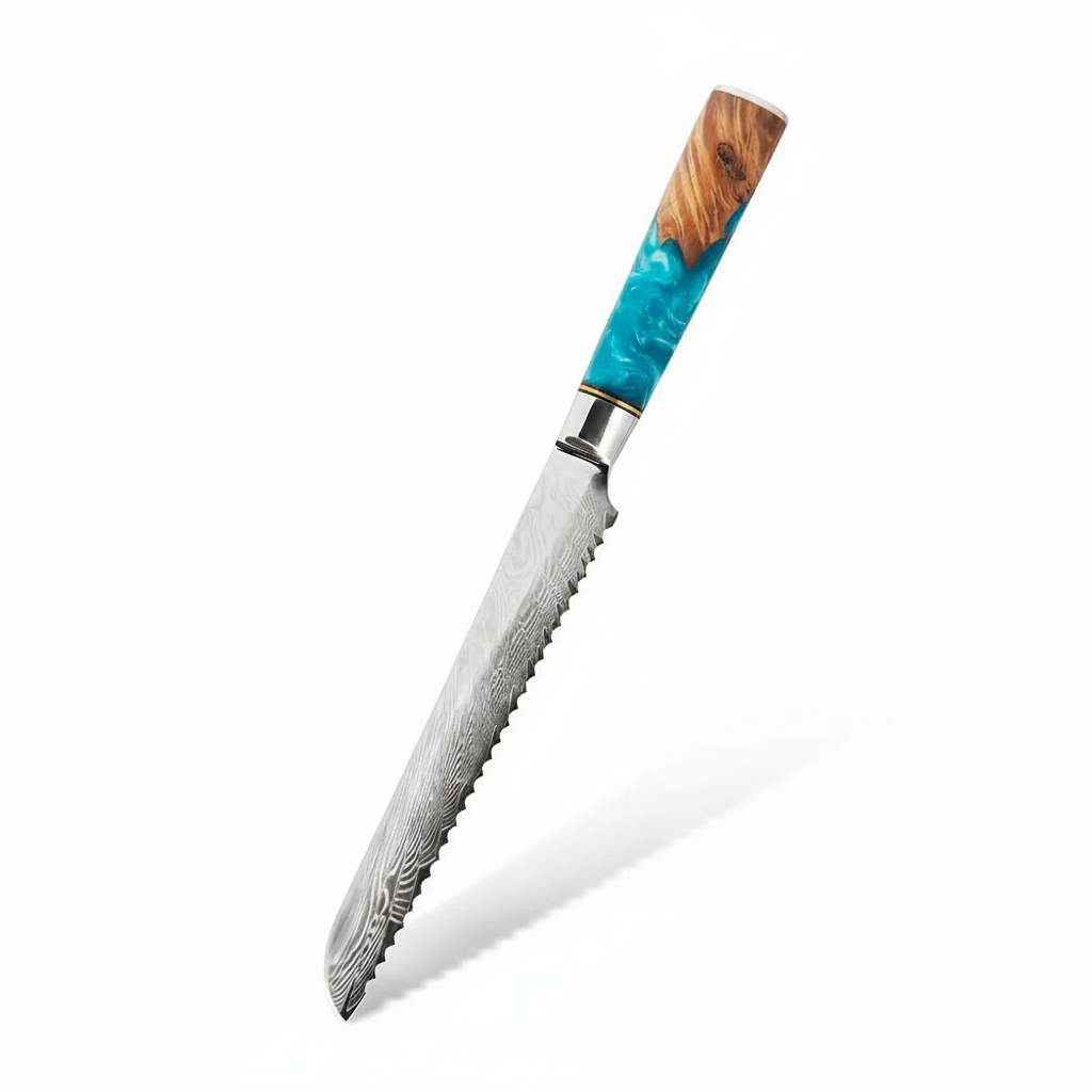 Couteau à pain Niigata – Lame damassée & manche en bois et résine bleue