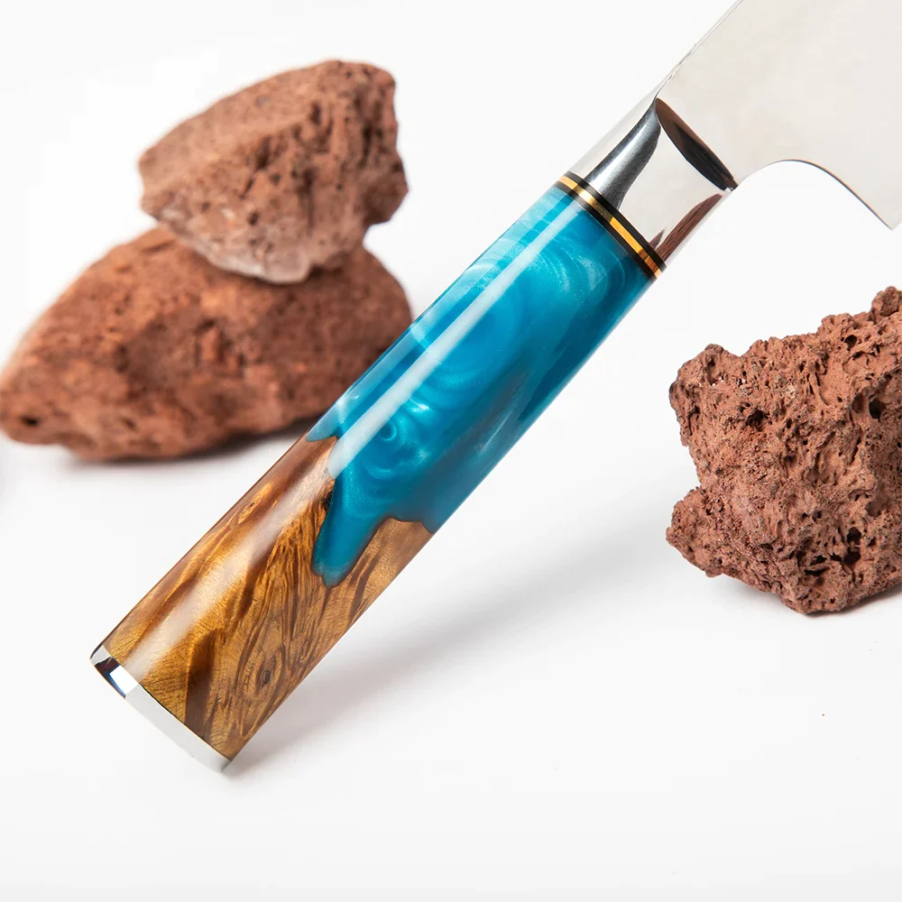 - Manche original fabriqué à partir d’un mélange de bois et de résine epoxy bleu