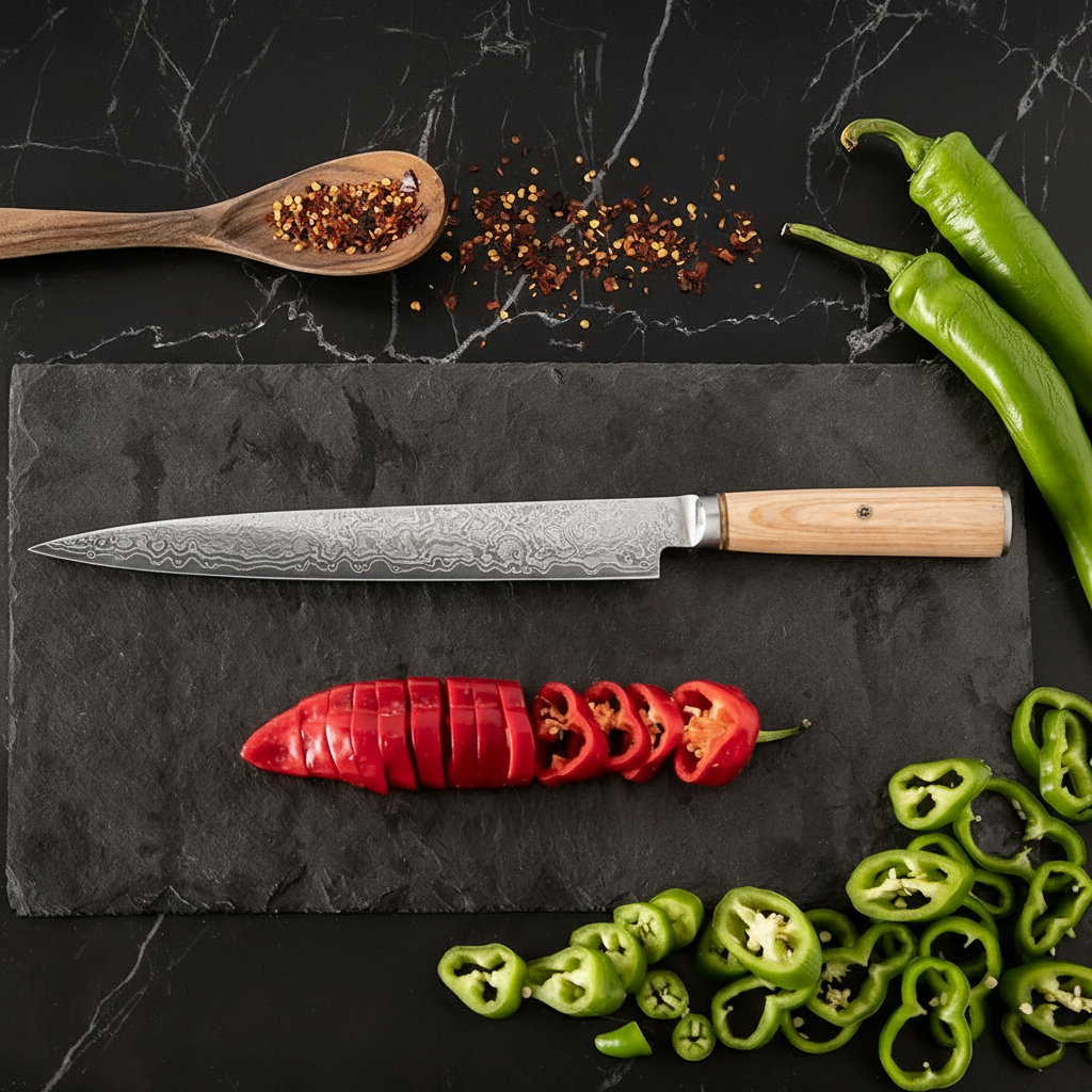 Ce couteau de gyuto est idéal pour les tâches de découpe, de tranchage de viande, poisson et légumes. Il est particulièrement adapté pour les tâches de préparation plus délicates telles que l'épluchage et le zestage. Avec ce couteau, vous pourrez également être un maître sushi; grâce à la longueur de la lame un seul passage sera nécessaire pour les coupes les plus complexes.