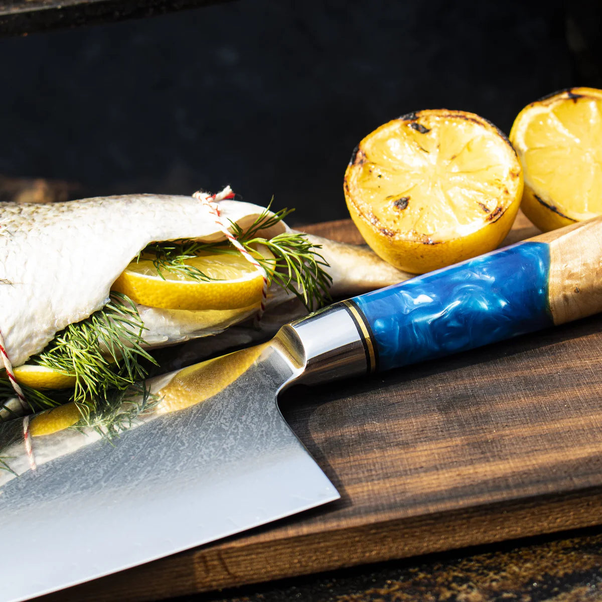 Son manche en bois et résine époxy bleue allie confort, équilibre et esthétique, faisant de chaque pièce un couteau unique.