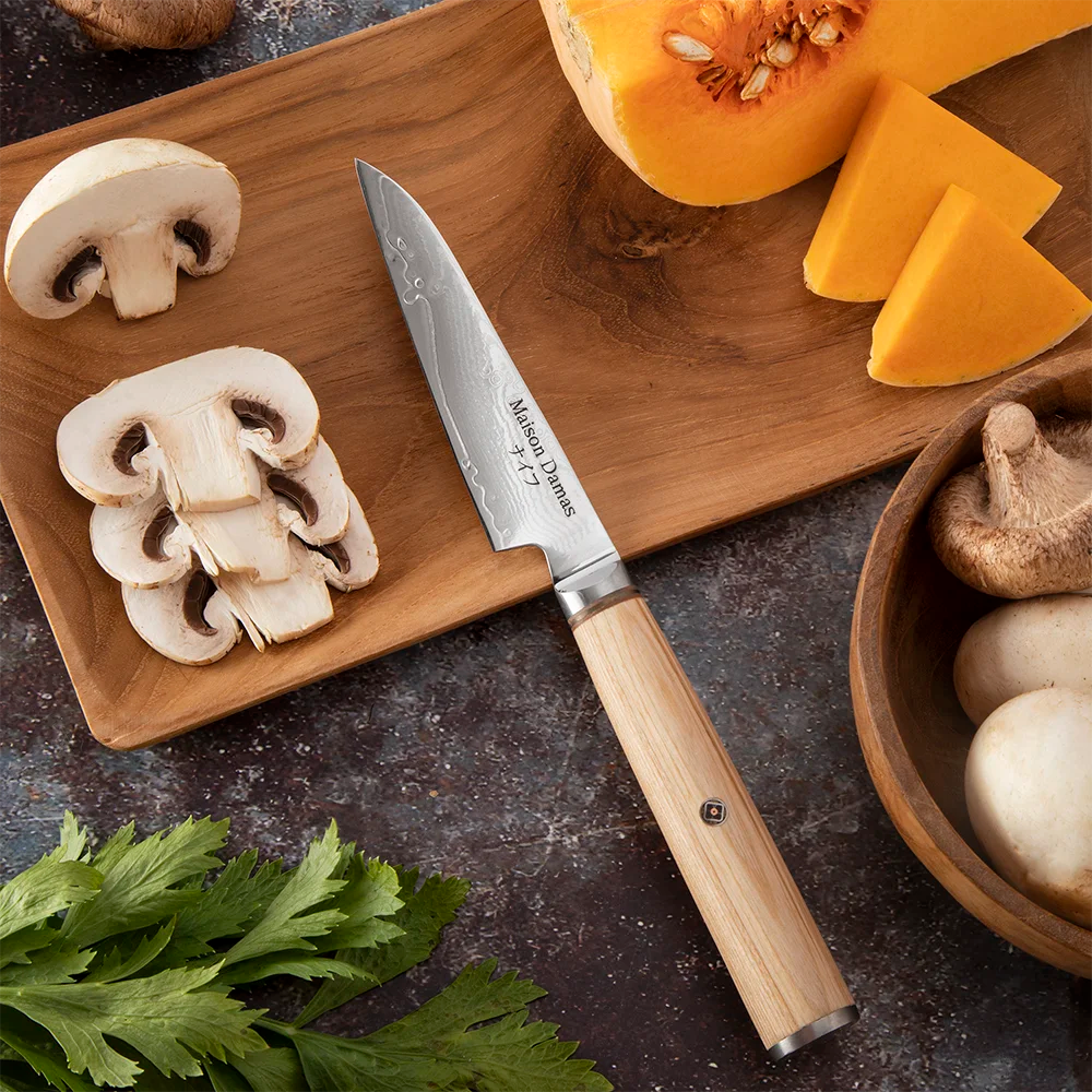 De par sa petite taille, ce couteau vous accompagnera dans les découpes fines et précises. En effet, vous pourrez exploiter tout son potentiel lors de vos découpes de finition sur des légumes, viandes ou poisson. Grâce à l'acier damas et son angle d'aiguisage à 15° sur chaque face, ce couteau coupe comme un rasoir ce qui permettra de ne pas abimer les aliments lors de la découpe et de les trancher parfaitement.