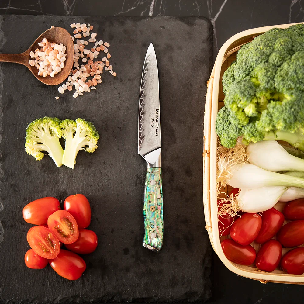 Chaque cuisine a besoin d'un bon couteau utilitaire. Avec une lame aussi tranchante, c'est le multitâche parfait au quotidien. Que vous cuisiniez, nettoyiez ou fassiez quoi que ce soit d'autre, procurez-vous le couteau utilitaire de qualité qui est facile à utiliser et qui fait tout. Avec une lame en acier damas 67 couches et nos reflets nacrés brevetés sur le manche, c'est le couteau utilitaire de vos rêves.